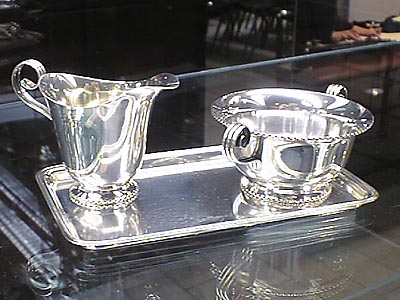 GRÄDDKANNA SAMT SOCKERSKÅL, silver samt BRICKA i nysilver.
