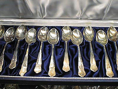 MATSILVER, kaffeskedar, 12 st, Oscar Olausson ca 1955, etui.