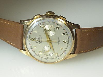 CHRONOGRAPHE SUISSE, kronograf, herrur, 18K guld, manuell, plexiglas, skadad urtavla, läderband, ca 1959.