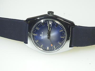 EDOX, herrur, vitmetall, manuell, plexiglas, datum, läderband, oanvänd, ca 1970.