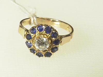 RING, 18K guld, gammalslipad diamant ca 0,34 ct, ca W/SI2, 11 safirer ca 0,80 ct, stl 16½.