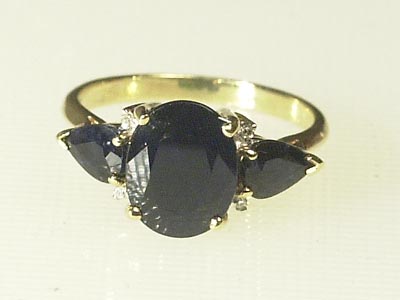 RING, 14K guld, 3 mörkblå safirer ca 4 ct totalt, 4 åttkantslip diam ca 0,02 ct, stl 16 3/4.