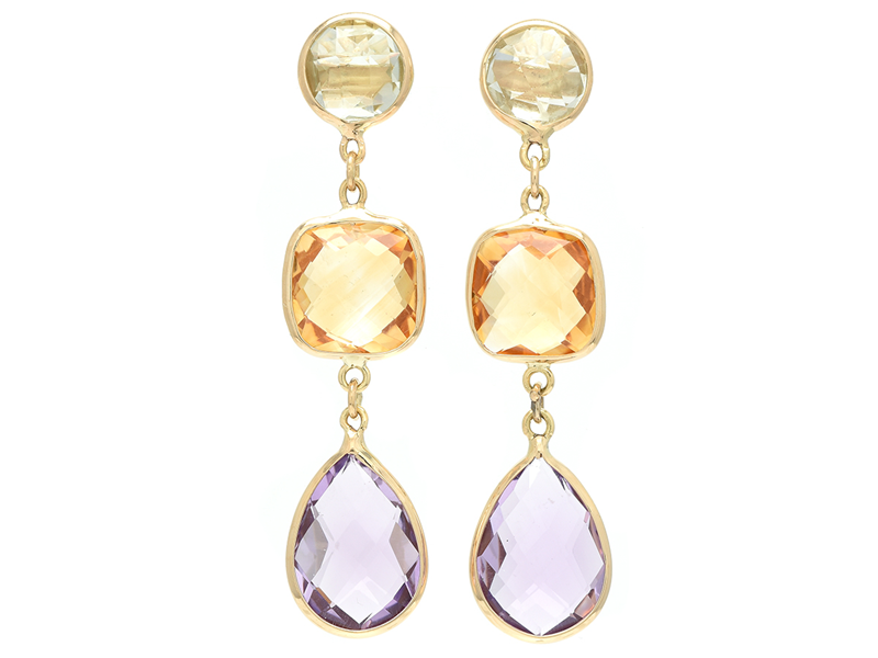 ÖRHÄNGEN, 18K guld med prasioliter 8 mm, citriner 10 mm och ametister 14x10 mm, stift