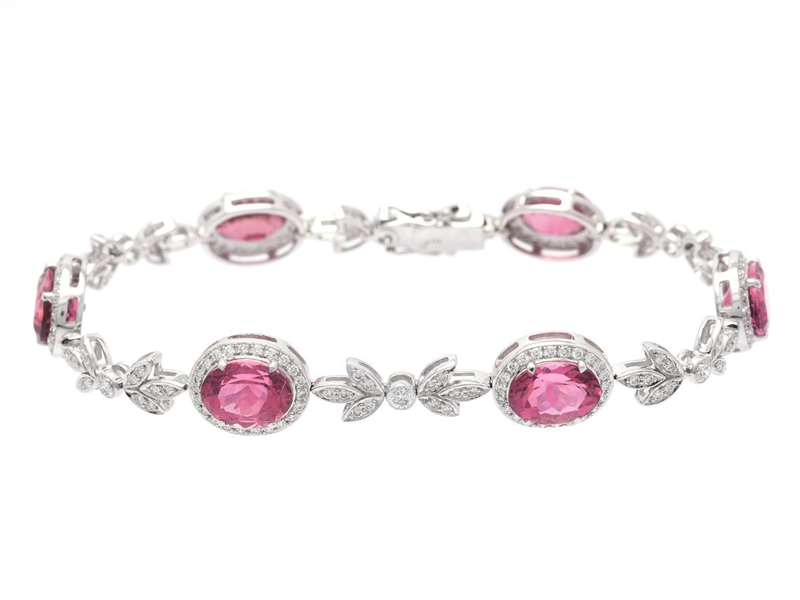 ARMBAND, 18K vitguld, 210 briljantslipade diamanter ca 1,77 ctv, ca TW-Cr/VS-SI, 6 ovala fasetterade rosa turmaliner ca 12,03 ctv, längd 18 cm, vikt 15,0 g, några briljanter med ytdefekter och inneslutningar som når ytan, turmaliner med mindre ytskador.