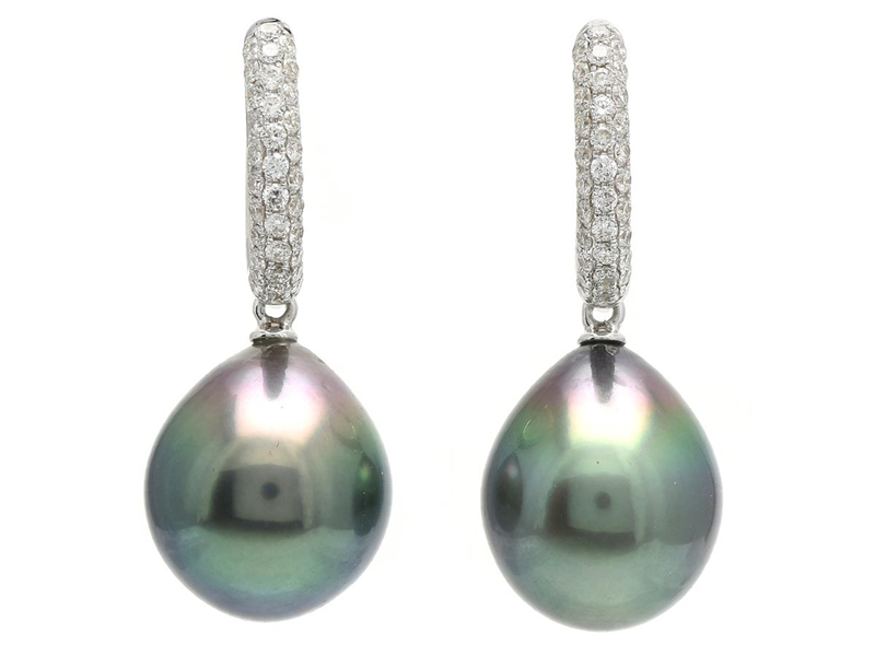 PÄRLÖRHÄNGEN, 18K vitguld med ovala Tahitipärlor 10,4 mm, 68 briljanter 0,36 ctv, ca W/SI, stängbar krok,