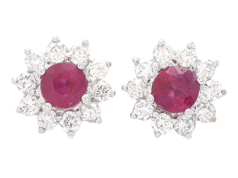 CARMOSÉÖRHÄNGEN, 18K vitguld, 2 fasettslipade rubiner ca 0,47 ctv, 20 briljantslipade diamanter ca 0,27 ctv, ca W-TCr/SI-P, stift, vikt 1,5 g, diameter 7 mm.