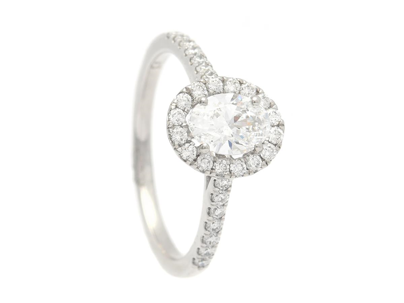 RING, platina, ovalslipad diamant 0,70 ct, River(D)/SI1, GIA Report 7386224783, 30 briljantslipade diamanter ca 0,32 ctv, ca TW-TCr/SI, stl 17,25 mm, vikt 3,9 g.
