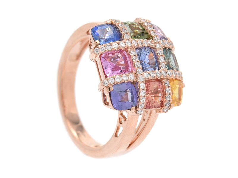 RING, 18K roséguld, 9 kuddslipade olikfärgade safirer ca 3,25 ctv, 60 briljantslipade diamanter ca 0,25 ctv, ca TW/VS, storlek 16,75+ mm, vikt 7,4 g.