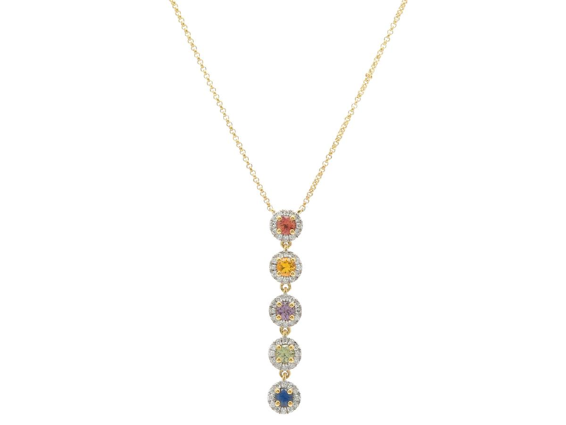 COLLIER, 18K guld, 5 runda fasettslipade olikfärgade safirer ca 0,56 ctv, 60 briljantslipade diamanter ca 0,17 ctv, ca TW-W/VS-SI, "hängets" längd ca 33,0 mm, längd 42/45 cm, vikt 4,5 g.