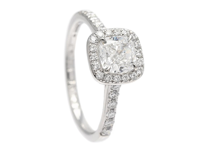 RING, platina, kuddformad briljantslipad diamant 0,93 ct, River(D)/SI1, GIA Diamond Dossier 6352891562, 42 briljantslipade diamanter ca 0,35 ctv, ca R-W/VS-SI, storlek 16,75+ mm, vikt 4,5 g, någon av de mindre diamanterna har nagg på kulett.