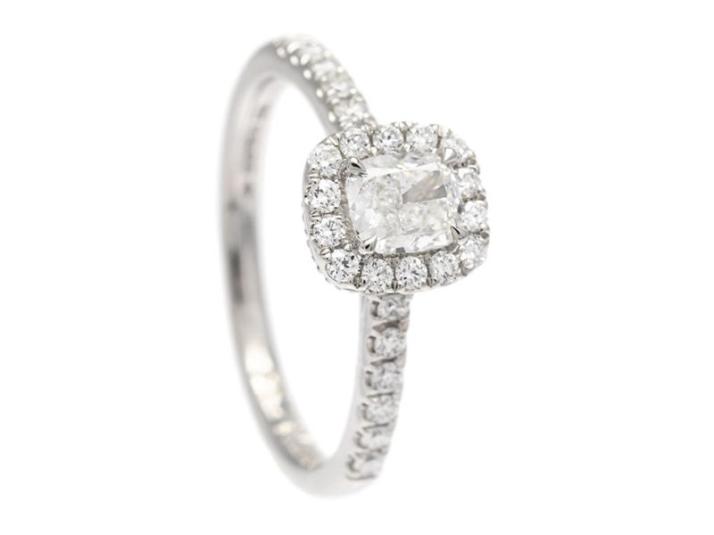 RING, platina, kuddformad briljantslipad diamant 0,51 ct, River(E)/SI1, GIA Diamond Dossier 6411673352, 46 briljantslipade diamanter ca 0,34 ctv, ca R-W/VS-SI, storlek 16,75+ mm, vikt 4,2 g.