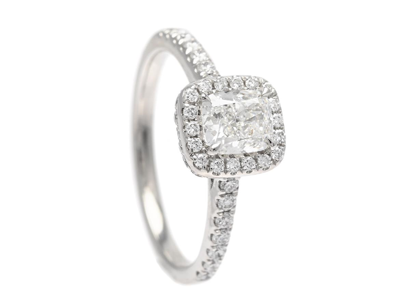 RING, platina, kuddformad briljantslipad diamant 0,70 ct, TW(F)/SI1, GIA Diamond Dossier 7396288771, 54 briljantslipade diamanter ca 0,35 ctv, ca TW/VS-SI, storlek 16,75+ mm, vikt 4,5 g.
