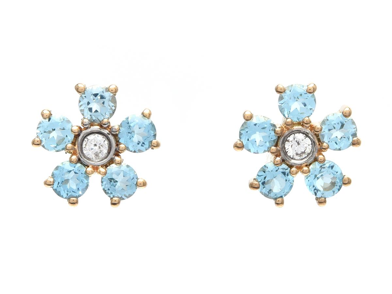 ÖRHÄNGEN, 18K guld, 10 runda fasettslipade blå topaser ca 0,85 ctv, 2 briljantslipade diamanter ca 0,05 ctv, ca Cr/SI-P, stift, diameter ca 8,0 mm, vikt 1,5 g.