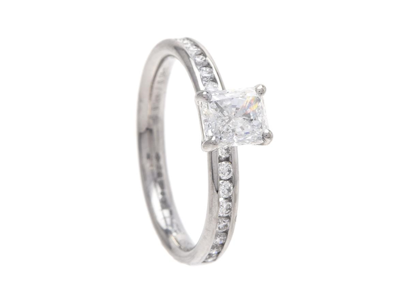 RING, platina, radiantslipad diamant 0,91 ct, River(E)/SI1, GIA Diamond Dossier 2225324565, 16 briljantslipade diamanter ca 0,24 ctv, ca TW/VS-SI, storlek 16,75 mm, vikt 4,3 g.