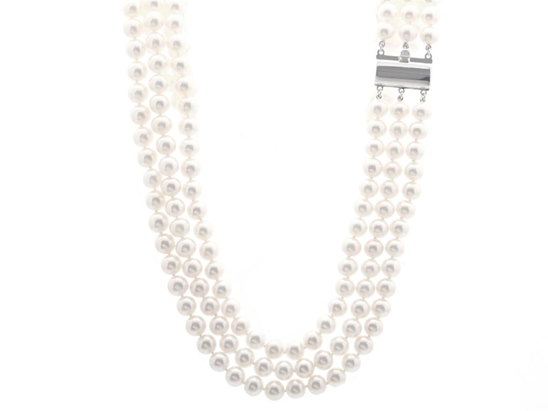 PÄRLCOLLIER, 3 rader, odlade sötvattenspärlor ca 7,0-7,5 mm, lås i sterlingsilver, knutet, längd 48 cm.