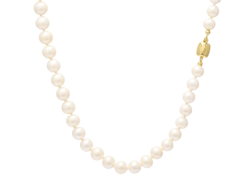 PÄRLCOLLIER, odlade sötvattenspärlor ca 8,0-9,0 mm, knutet, lås i förgyllt sterlingsilver, längd ca 45 cm.