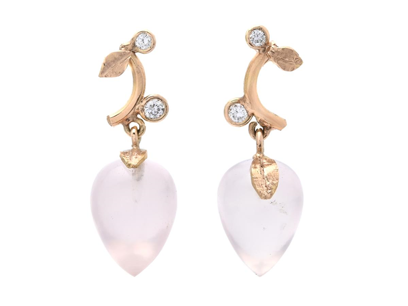 ÖRHÄNGEN, 18K guld, rosenkvarts, briljantslipade diamanter 0,10 ctv, Mandelstam, höjd 28 mm, vikt 5,5 g, stift, originalask.
