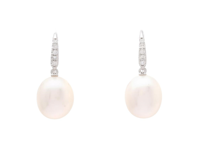 PÄRLÖRHÄNGEN, 18K vitguld, odlade sötvattenspärlor ca 9,0-9,5 mm, 10 briljantslipade diamanter ca 0,10 ctv, ca W/SI, krokar, längd 21,0 mm, vikt 3,5 g.