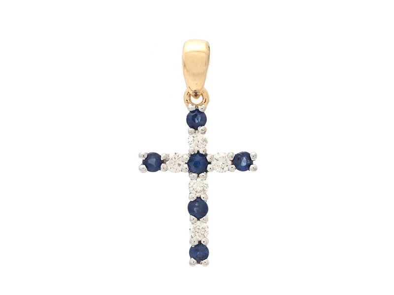 HÄNGE, 18K guld, kors, 6 runda fasettslipade blå safirer ca 0,13 ctv, 5 briljantslipade diamanter ca 0,09 ctv, ca W/SI-P, höjd 13,0 mm, bredd 9,0 mm, vikt 0,5 g.