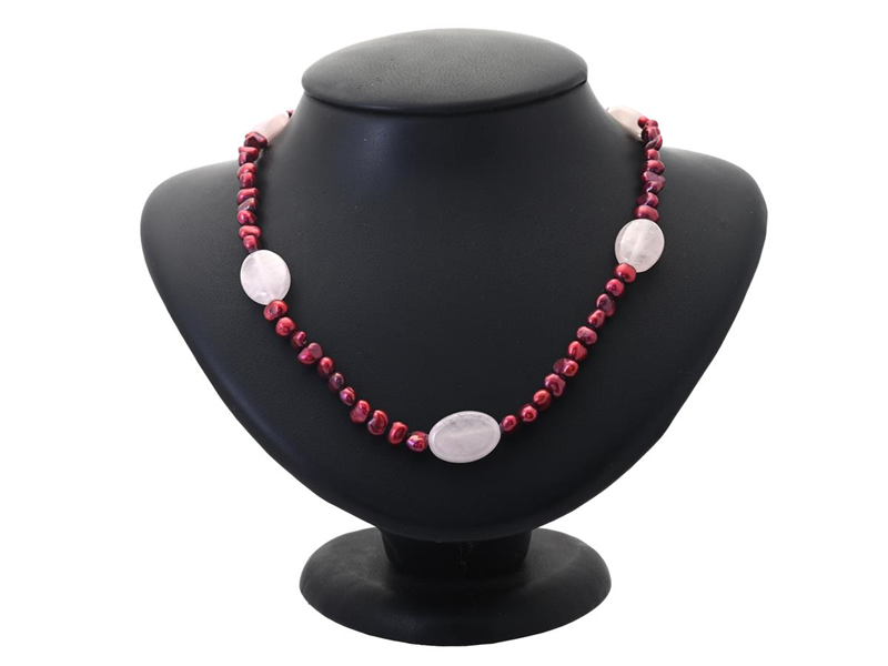 COLLIER, odlade färgade sötvattenspärlor, röda, rosenkvarts, längd 45 cm.