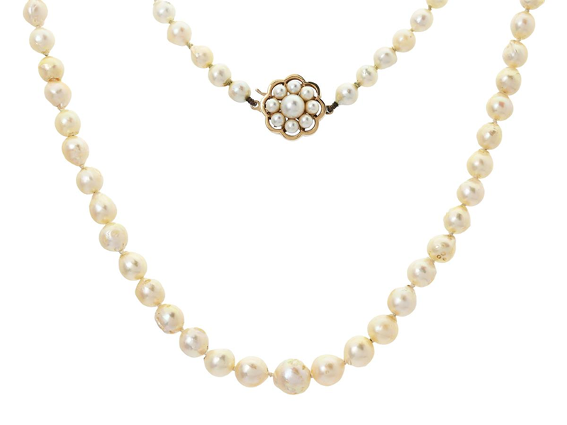 PÄRLCOLLIER, odlade pärlor, barocka, ca 5,5 - 7,75 mm, lås i 18K guld med odlade pärlor, längd 46 cm, 24,4 g.
