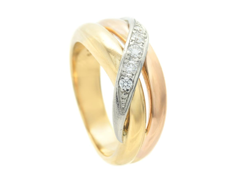 RING, 18K guld/roséguld, platina, briljantslipade diamanter 0,12 ctv enligt gravyr, ca TW/VS, stl 16,25 mm, vikt 8,6 g.