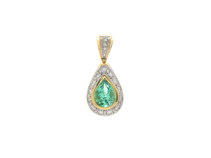 HÄNGE, 18K guld, droppslipad smaragd ca 4,50 ct, 16 briljantslipade diamanter ca 0,95 ctv, ca TW(F-G)/VVS-VS, längd 38 mm, vikt 11,0 g, smaragden med mindre spirckbildningar som når ytan, ett fåtal diamanter med nagg.