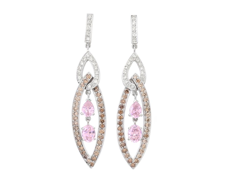 ÖRHÄNGEN, 18K vitguld, cubic zirkonia, 68 bruna briljantslipade diamanter ca 1,284 ctv, 36 briljantslipade diamanter ca 0,36 ctv, ca TW-Cr/VS-P, höjd 55 mm, vikt 16,1 g, några diamanter med nagg, två diamanter med brännmärken, en snurrebuss saknas.