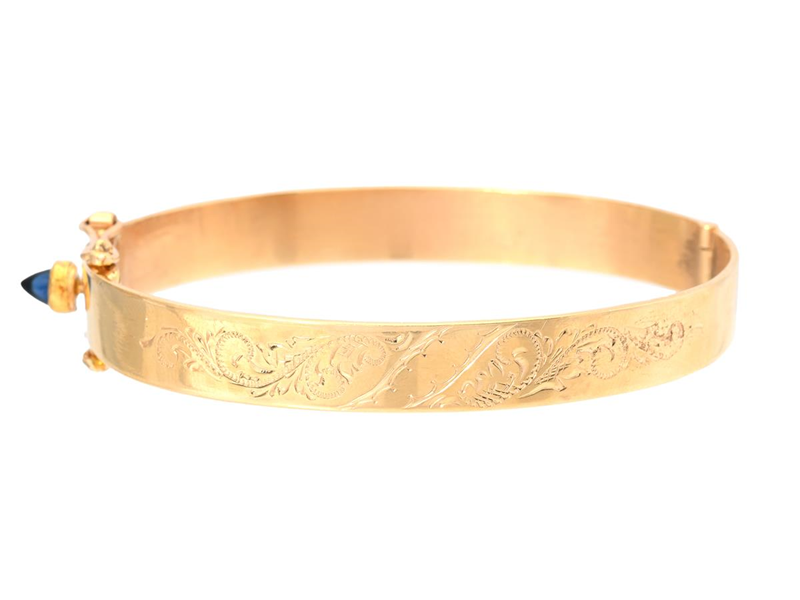 ARMRING, 18K guld, sockertoppslipad safir, troligen syntetisk, graverad dekor, Liljegren Juvelerare 1970, öppningsbar, innermått 57x52 mm, vikt 24,2 g, mindre nagg på safiren och dess fattning, safiren är lös.