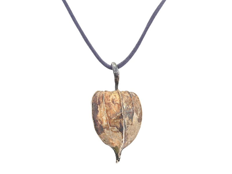 HÄNGE, silverpläterad physalis, Bluealg, mått ca 55,0 x 30,0 mm, silkessnöre med silverlås, längd 70 cm, vikt 10,2 g.