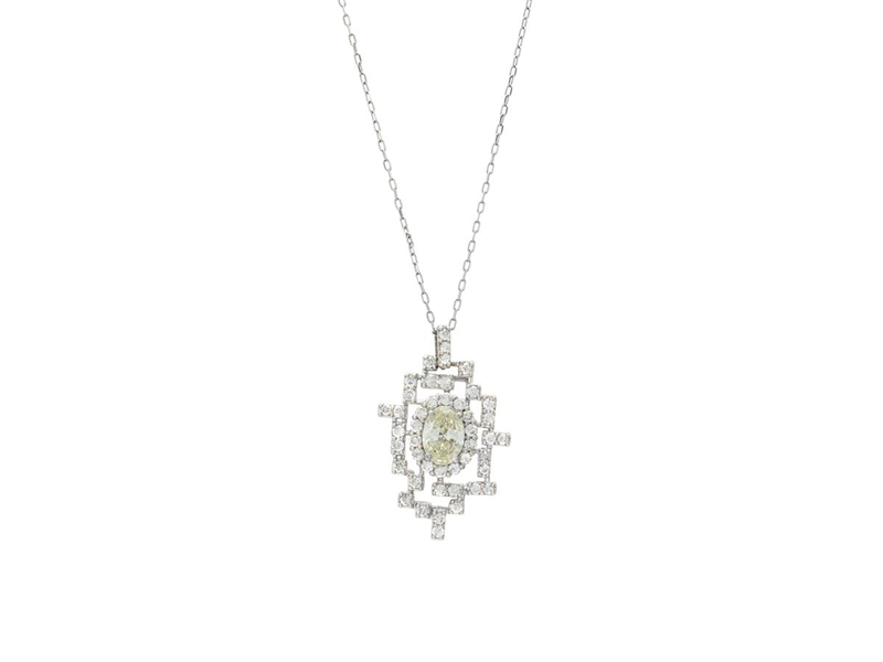 HÄNGE MED KEDJA, platina, ovalslipad diamant ca 0,62 ct, ca Light Yellow/SI, 31 briljantslipade diamanter ca 0,58 ctv, ca TW-TCa/SI-P, längd 36 - 40 cm, vikt 3,9 g.