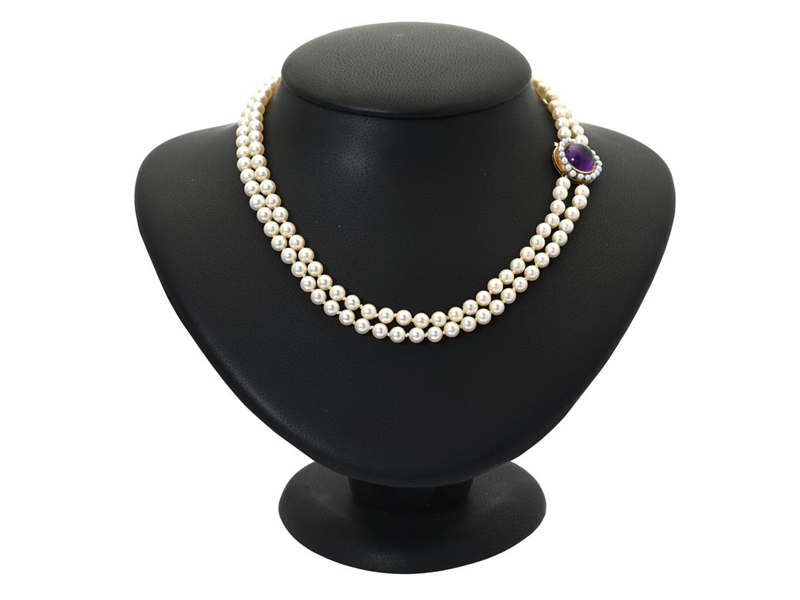 PÄRLCOLLIER, 2-radigt, odlade pärlor ca 4,5-5,0 mm, lås i 18K guld, cabochonslipad ametist, fröpärlor, Stockholm 1961, längd 38 cm, knutet, vikt 24,7 g.