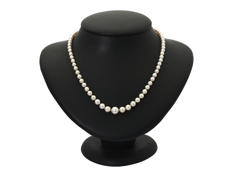 PÄRLCOLLIER, odlade pärlor, doserat, lås i 18K guld, längd 55 cm, knutet, vikt 14,0 g.