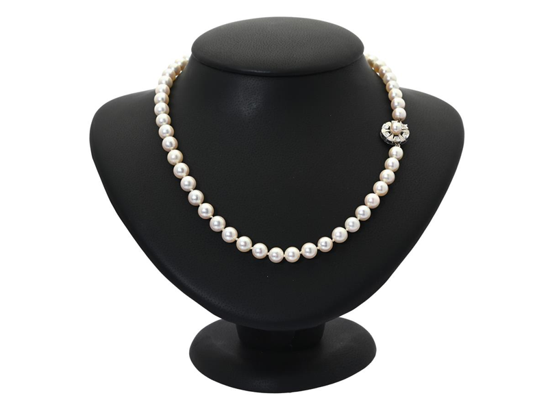 PÄRLCOLLIER, odlade pärlor, lås i 18K vitguld, åttkantslipade diamanter, längd 42 cm, knutet, vikt 24,4 g.