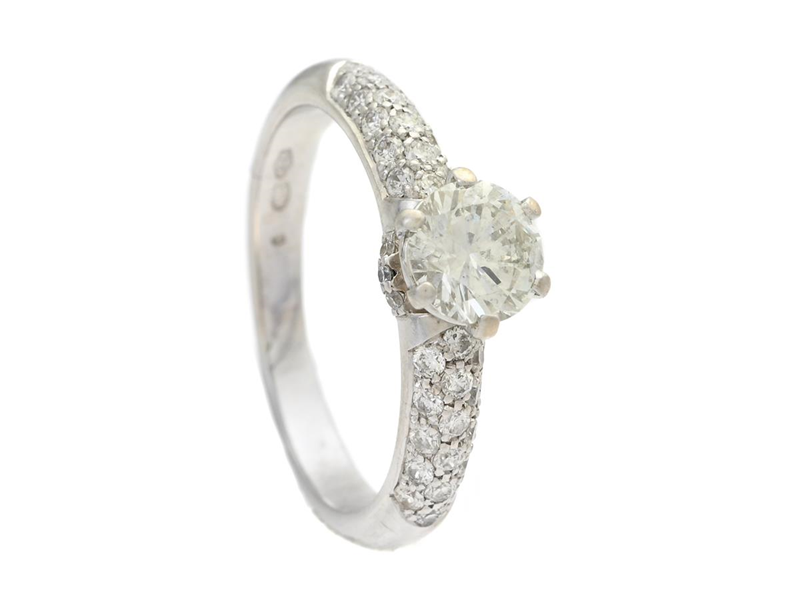 RING, 18K vitguld, briljantslipad diamant 0,71 ct, TCr(I)/VS1, inskription GIA 5161017555, 32 briljantslipade diamanter 0,36 ctv, ca TW-W/VS, stl 16,5 mm, vikt 3,5 g.