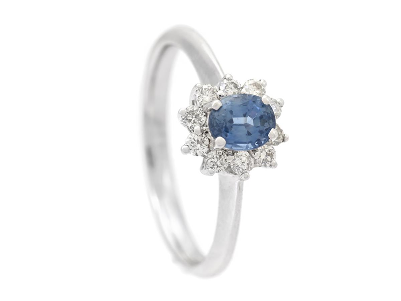 CARMOSÉRING, 18K vitguld, blå safir 0,64 ct, 10 briljantslipade diamanter 0,23 ctv, ca W-TCr/SI, storlek 17,25 mm, vikt 2,9 g, två diamanter med inverterade naturaler.