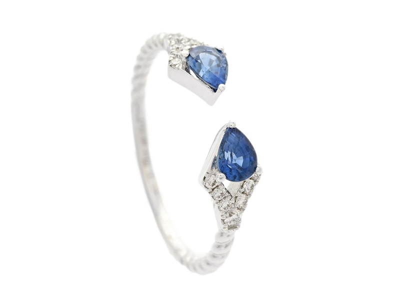 RING, 18K vitguld, droppformade fasettslipade blå safirer 0,59 ctv, 14 briljantslipade diamanter 0,11 ctv, ca W-Cr/SI, storlek 17,5 mm, öppen modell, vikt 2,1 g.