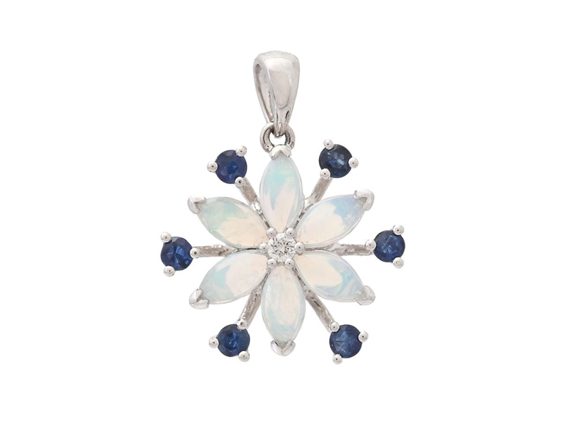 HÄNGE, 18K vitguld, vita opaler 0,45 ctv, 6 runda fasettslipade safirer 0,24 ctv, briljantslipad diamant 0,02 ct, ca TCr/SI, mått 13,0 mm, vikt 1,4 g.
