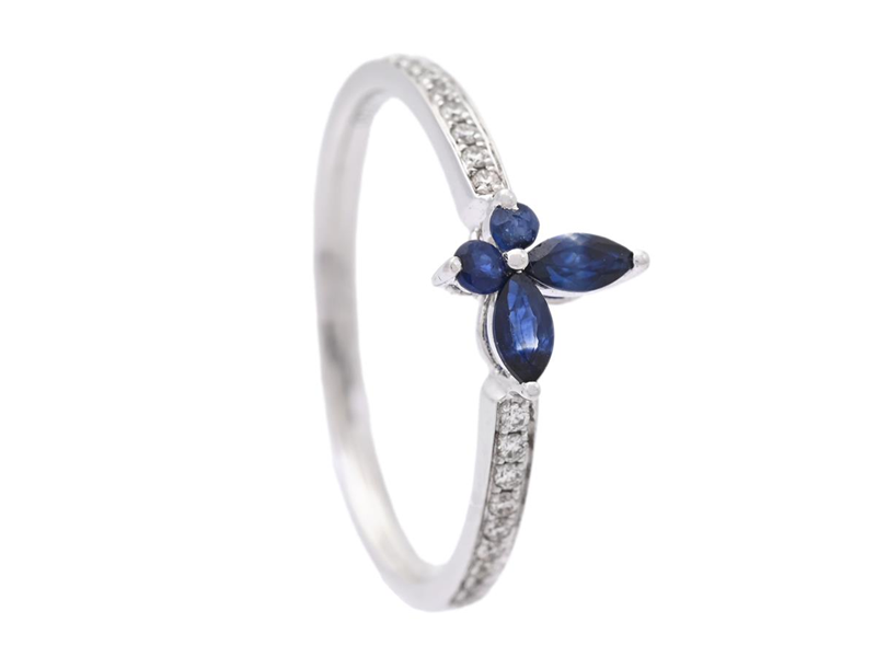 RING, 18K vitguld, navettslipade och runda fasettslipade safirer 0,34 ctv, 18 briljantslipade diamanter 0,10 ctv, ca W-TCa/SI, storlek 17,25 mm, vikt 1,9 g, några diamanter med ytdefekter.