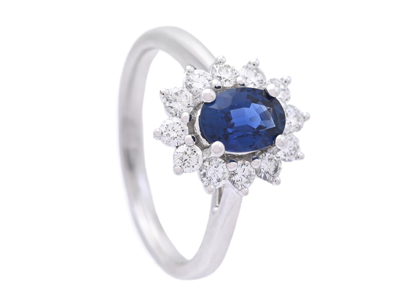CARMOSÉRING, 18K vitguld, oval fasettslipad blå safir 1,01 ct, 12 briljantslipade diamanter 0,55 ctv, ca TW/VS, storlek 17,5 mm, vikt 5,0 g.
