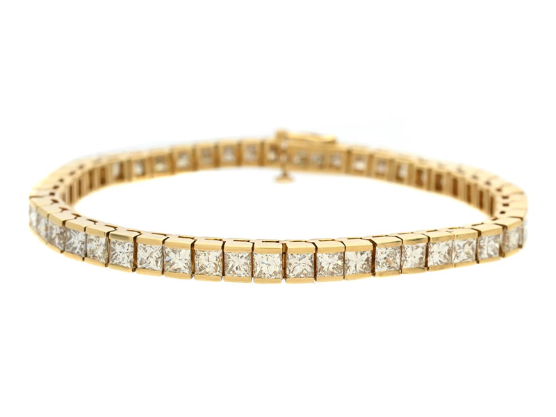 TENNISARMBAND, 18K guld, 49 prinsesslipade diamanter ca 8,80 ctv, ca TW/VS-SI, längd 17,5 cm, vikt 26,4 g, trasig vid säkerhetsåttan.