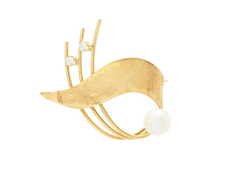 BROSCH, 18K guld, odlad sötvattenspärla, vita stenar, mått 3,3 x 3,5 cm, vikt ca 6 g.