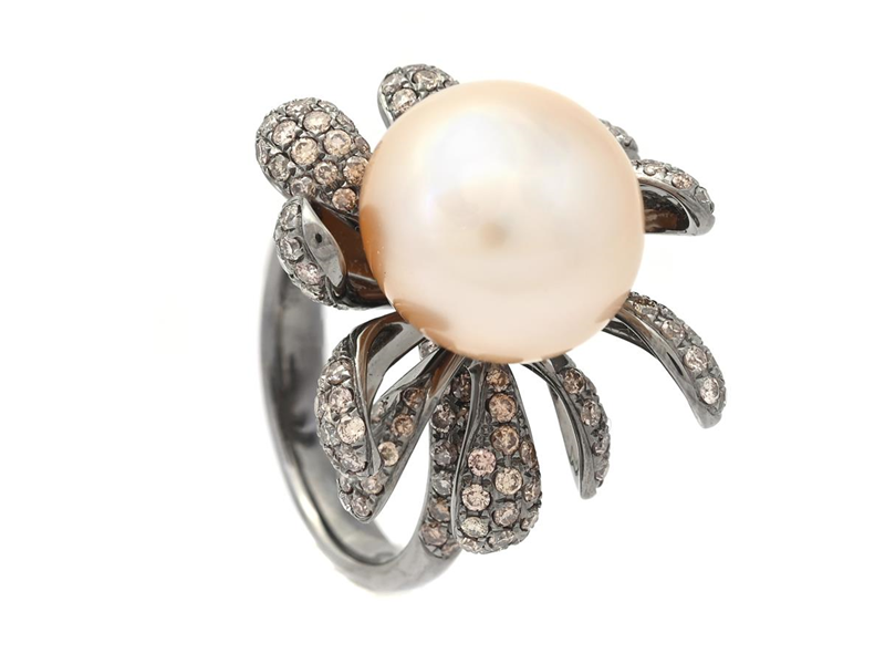 RING, 18K vitguld, svartrodierat, South Sea pärla ca 12,8 mm, 194 briljantslipade diamanter ca 1,69 ctv, ca light brown/VS-SI, storlek 17 mm, vikt 12,1 g.