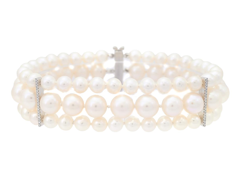 PÄRLARMBAND, treradigt, odlade sötvattenspärlor ca 5,0/7,5 mm, knutet, lås i 18K vitguld, 63 briljantslipade diamanter ca 0,16 ctv, ca W/VS-SI, längd 19 cm, vikt 32,1 g.