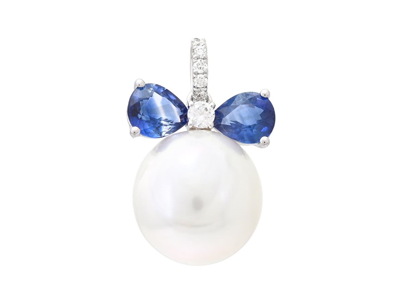PÄRLHÄNGE, 18K vitguld, South Sea pärla ca 10,5 mm, droppformade fasettslipade blå safirer 0,98 ctv, 6 briljantslipade diamanter 0,08 ctv, ca TW-W/VS, längd 18,0 mm ink ögla, vikt 2,5 g.