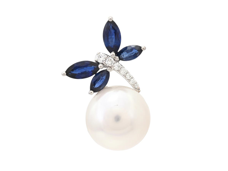 PÄRLHÄNGE, 18K vitguld, South Sea pärla ca 11,2 mm, trollslända med 4 navettslipade safirer 1,06 ctv, 7 briljantslipade diamanter 0,07 ctv, ca TW-W/VS-SI, höjd 23,0 mm, vikt 3,4 g.