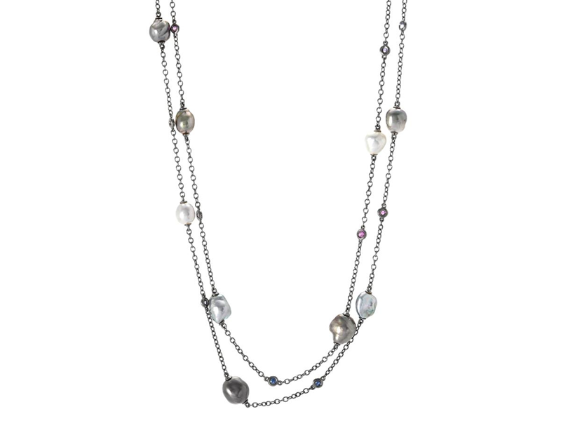 PÄRLCOLLIER, 18K svartrodinerat vitguld, 20 Keshi pärlor 5,2-7,7 mm, 18 safirer 0,40 ctv, längd 100 cm, vikt 14,7 g.