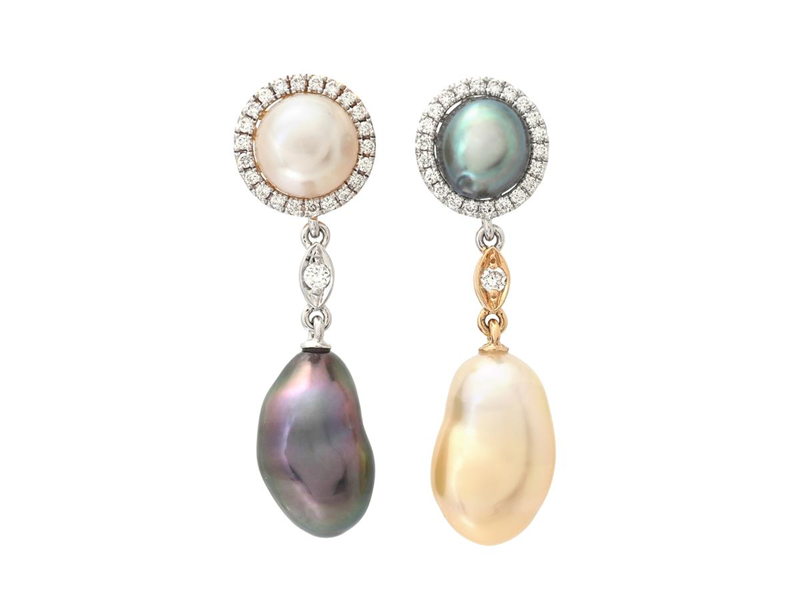 PÄRLÖRHÄNGEN, 18K guld/vitguld, South Sea och Tahitipärlor (Keshi), 46 briljantslipade diamanter 0,19 ctv, ca TW-W/VS-SI, stift, längd 29,0 mm, vikt 4,6 g.