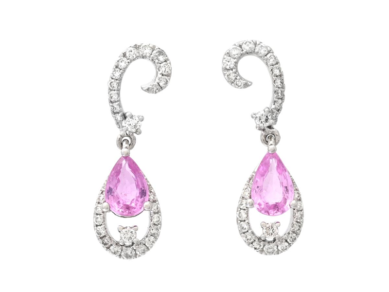 ÖRHÄNGEN, 18K vitguld, droppformade fasettslipade rosa safirer 0,80 ctv, 58 briljantslipade diamanter 0,32 ctv, ca W-TCr/SI-P, stift, längd 20,0 mm, vikt 2,5 g, några stenar med ytdefekter.