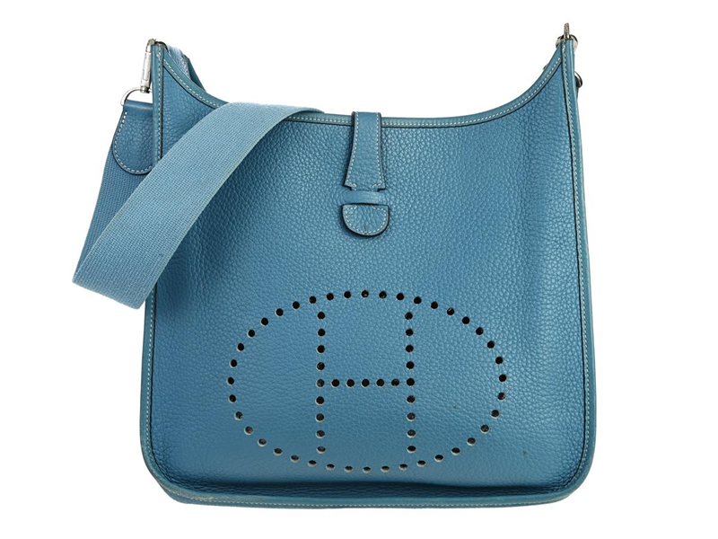 VÄSKA, HERMÈS, Evelyn 1 GM, Togo, blått läder, silverfärgade beslag, 32x31x9 cm, I in square, år 2005, bruksslitage.